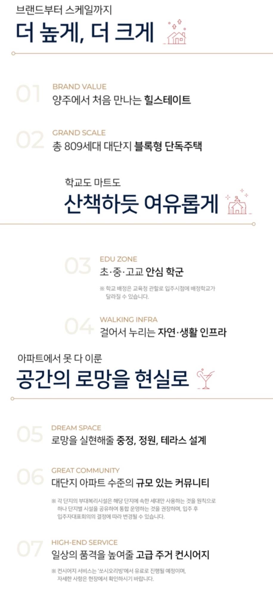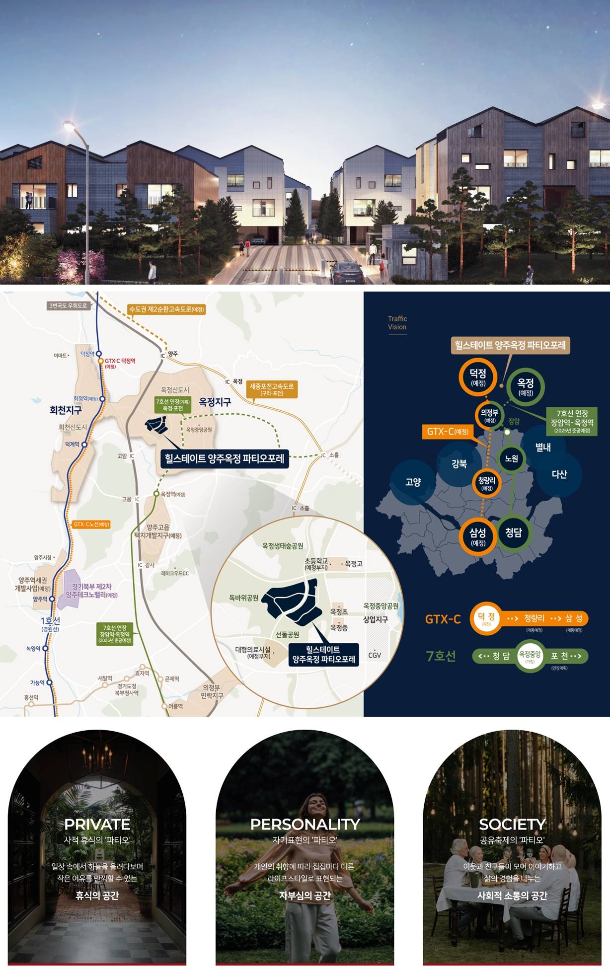 809세대 규모의 초대형 블록형 단독주택 13개 블록으로 완성되는 양주옥정의 압도적 주거 단지 총 809세대의 대규모 단지로 조성되어 아파트의 편리함과 단독주택의 독립성을 동시에 누리는 새로운 주거 표준을 제시합니다. 중정과 테라스 그리고 다락의 낭만 개인 정원과 다목적 공간이 포함된 특화 설계 세대별 중정, 야외 테라스, 다락방이 모두 포함된 층별 설계로 가족만을 위한 프라이빗하고 다채로운 라이프스타일이 가능합니다. 현대건설 힐스테이트의 프리미엄 가치 대한민국 대표 브랜드가 만드는 고품격 주거 브랜드 타운 힐스테이트만의 차별화된 시공 능력과 브랜드 파워를 통해 살수록 가치가 높아지는 주거 프리미엄을 경험할 수 있습니다. GTX-C와 7호선 연장의 미래 비전 강남까지 빠르게 연결되는 쾌속 교통망 확보 GTX-C 노선과 지하철 7호선 연장 사업을 통해 서울 핵심 지역으로의 접근성이 획기적으로 개선되는 미래 가치를 품고 있습니다. 옥정 중앙공원을 품은 에코 라이프 도심 속 자연을 만끽하는 쾌적한 주거 환경 양주옥정 신도시의 랜드마크인 중앙공원과 인접하여 사계절 변화하는 자연을 집 앞에서 누리는 건강한 일상을 선사합니다. 아파트급 대규모 커뮤니티 시설 운영 피트니스, 공유 오피스, 수영장 등 차별화된 인프라 단독주택에서 보기 힘든 대형 커뮤니티가 조성되어 운동, 취미, 휴식을 단지 안에서 모두 해결하는 원스톱 생활을 지원합니다. 단독 주차와 개별 정원의 여유 층간소음 걱정 없는 우리 가족만의 독립된 주거 공간 전 세대 전용 주차 공간과 독립된 구조를 통해 이웃 간 소음 분쟁 없이 온전한 휴식을 취할 수 있는 안심 주거 공간을 제공합니다.